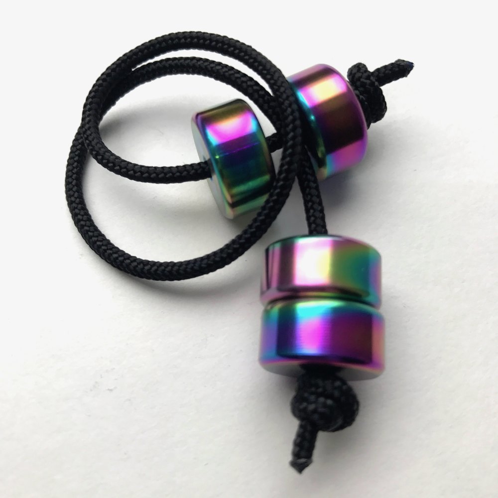 The titanium version comes with four beads, precision-machined from grade 5 titanium, weighing in at around 7g per bead, for a total of around 28g per set. The beads themselves are 16mm in diameter and 8mm thick, making for a 16x16mm stack at either end.