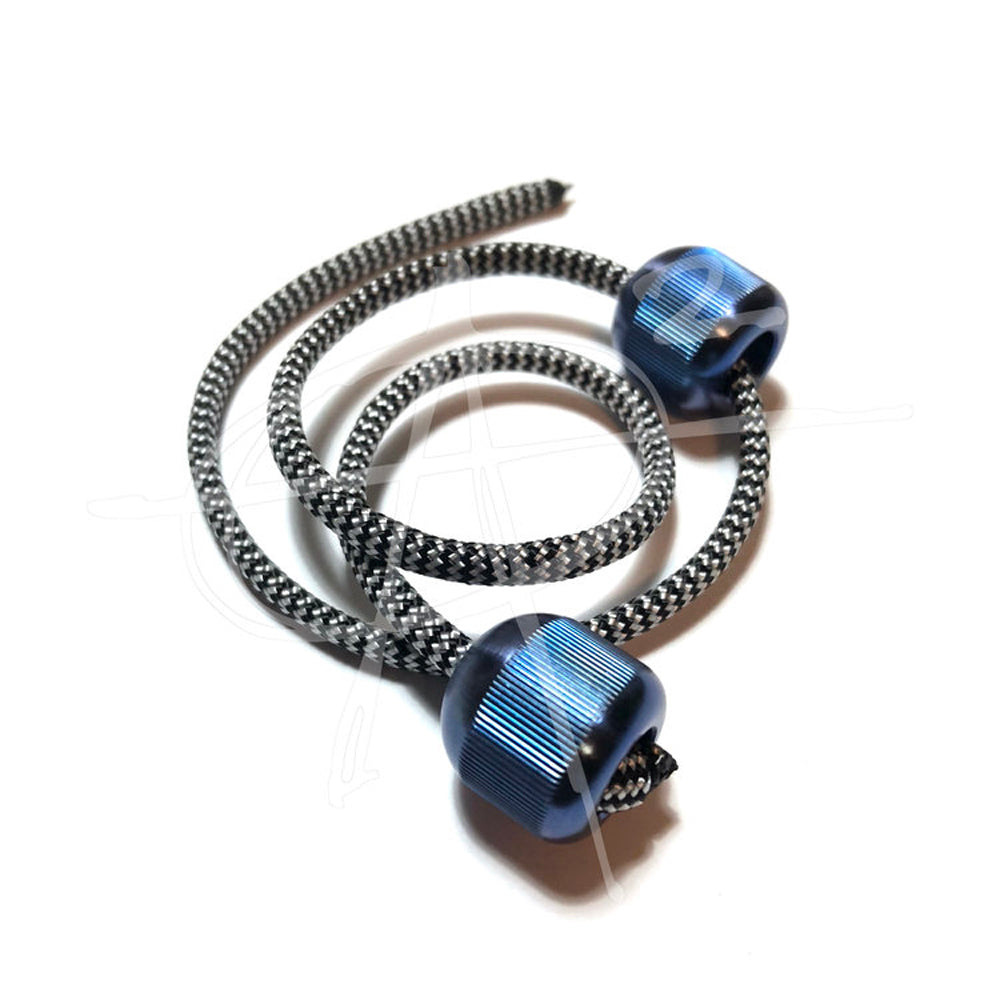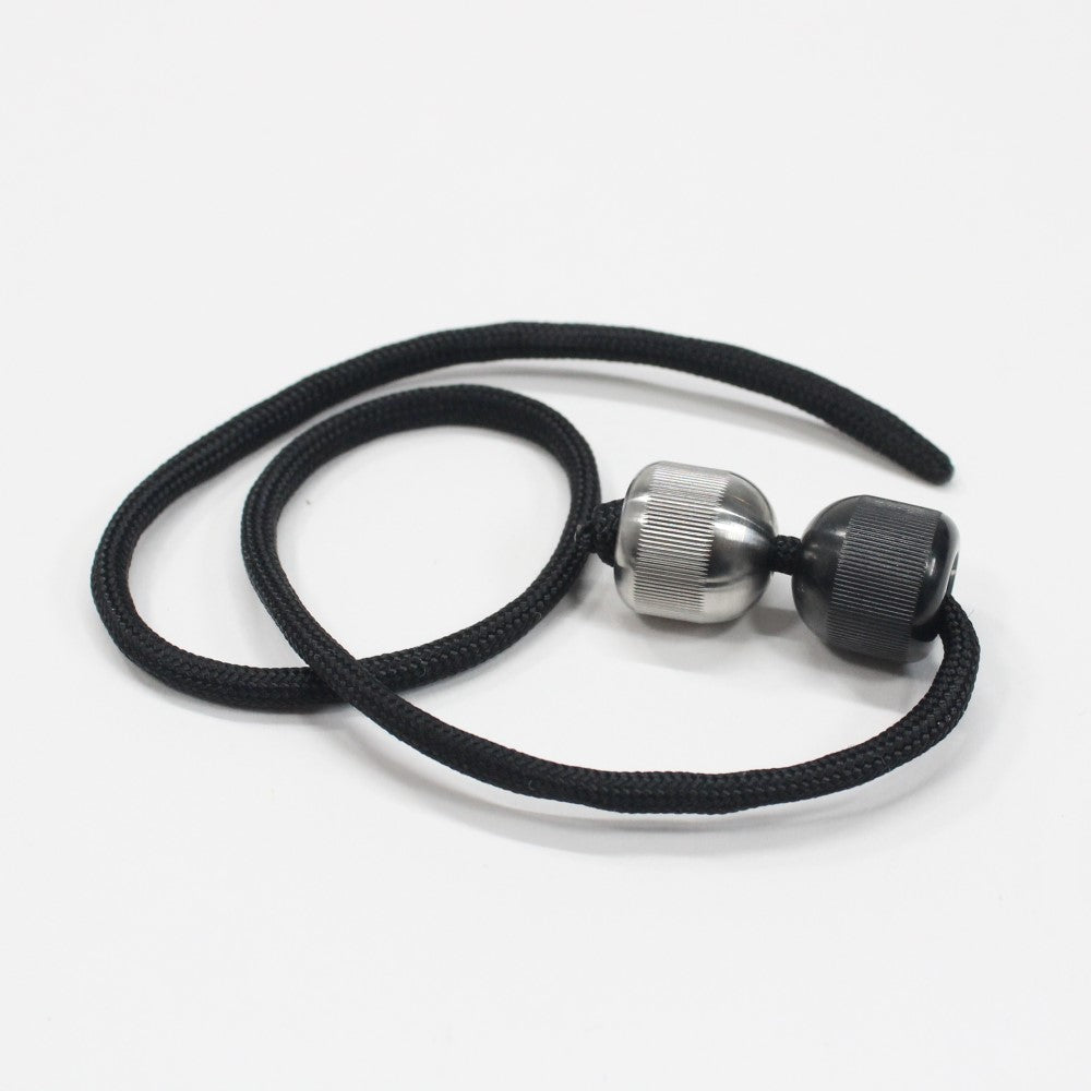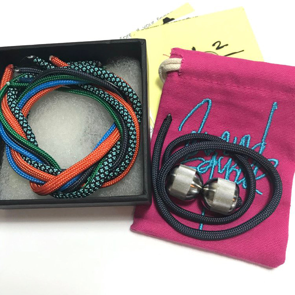 The Mini Titans feature a slightly larger bore diameter than the originals, and slightly smaller than most of the 550-compatible sets we sell. This "Goldilocks" bore is not to big and not too small.. it works well with 275 paracord and does not feel sloppy, but it also works extremely well with 550 paracord. Provided your 550 cord is cleanly cut with a melted tip, it should be possible to insert the 550 without any special tools or setup, and a minimum amount of fiddling. Each set is pre-strung on a strand of 550, and is packaged with some spare 275 AND 550 in the box. The sets also come with a fistful of stickers and a canvas carry bag.