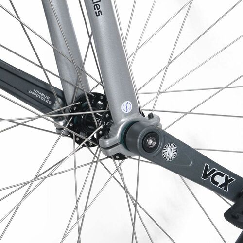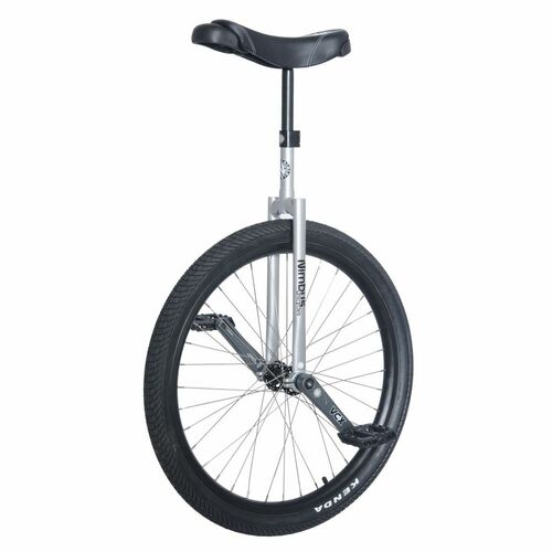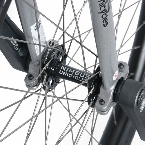 Versatile and stylish 26" Nimbus II unicycle. Saddle: Nimbus saddle with front lift handle Seat post: Nimbus 25.4mm x 300mm chromed steel or aluminum with a welded rectangular mounting bracket, 4 hole Seat post clamp: Impact 2 Bolt Seatpost Clamp - Black Frame: Nimbus II 26" (chrome) steel with 42mm machined maincap bearing housings Hub/axle: Nimbus ISIS (black) 48H, hardened CrMo splindle,100 mm center bearing to center bearing Spokes: 14G. stainless Chrome (265mm in length for 4X) with silver nipples Rim: Nimbus FS 26" (blue) 48H, 32mm wide, doublewall, reinforced eyelets, aluminum Rim strip: Rubber Tube size: 26" x 1.75" Tire: Kenda Kniption 26" x 2.30" Crank arms: Nimbus Venture 2 138mm ISIS, splined, aluminum Pedals: DX style, 9/16 threads, plastic Bearings: 22mm x 42mm Approx. cycle weight: 13 lbs.